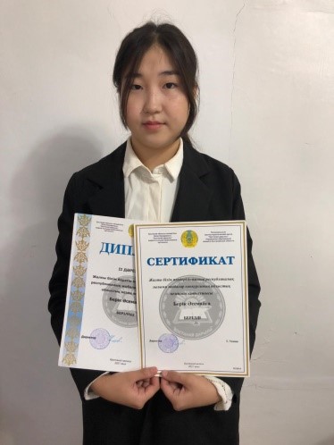 «Жангелдин ауданы білім бөлімінің Қанапия Қайдосов атындағы жалпы білім беретін мектебі» КММ-нің 11-сынып оқушысы. 2021 - 2022 оқу жылында облыстық оқушылардың ғылыми-жобалар байқауының жаратылыстану - математикалық бағыттағы пәндер бойынша 2 және 3 орын иегері. |